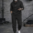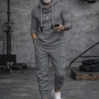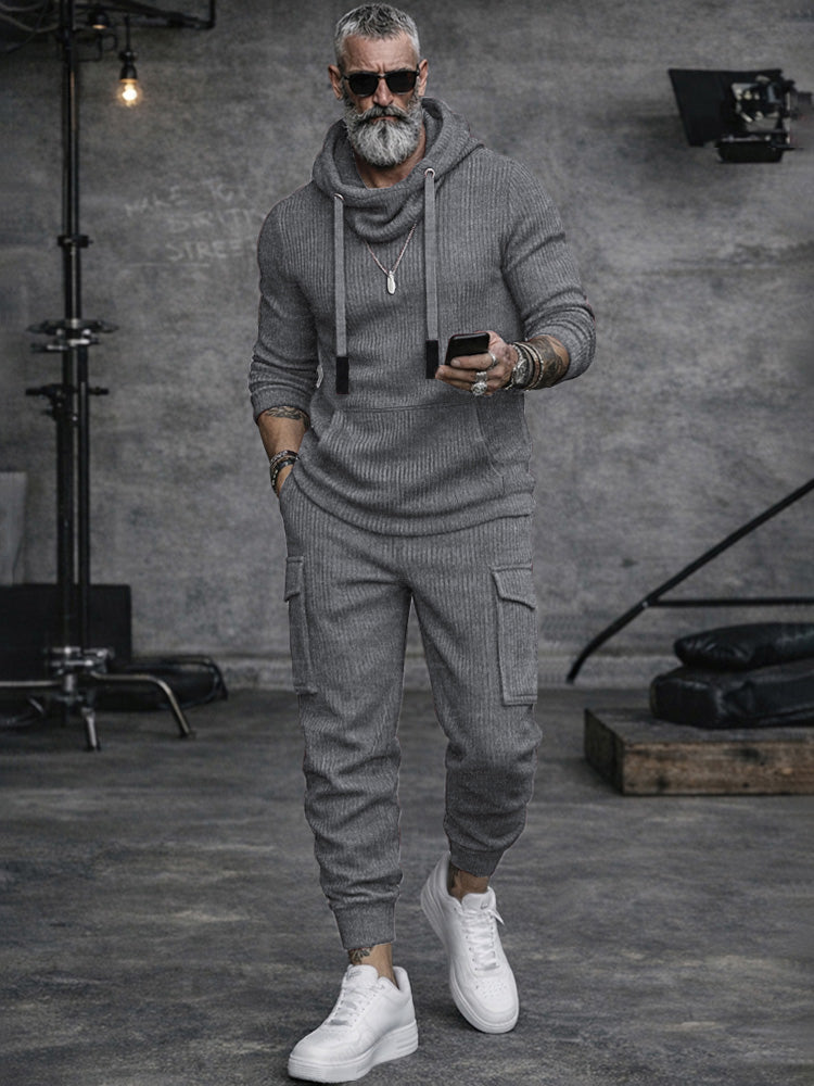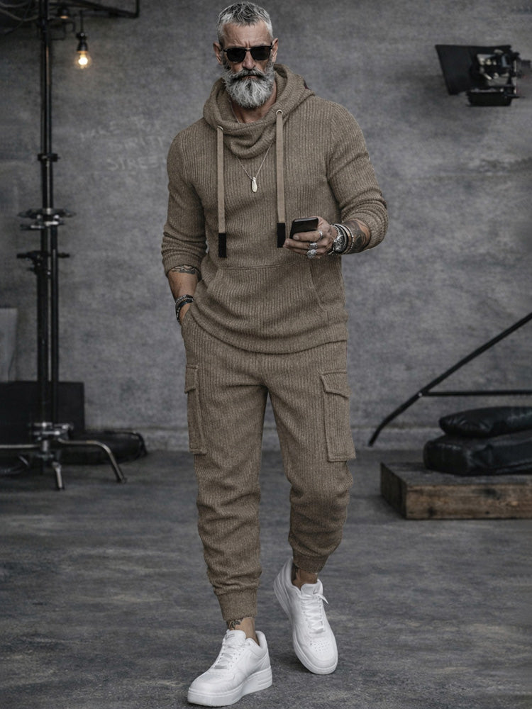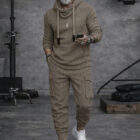 A sporty cargo-style matching set made from soft, durable knit fabric with slight stretch, featuring a hooded long-sleeve top and functional jogger pants designed for comfort, movement, and everyday versatility.